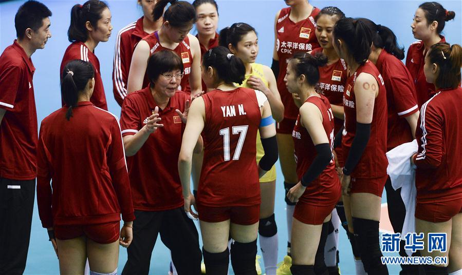 5月28日,中国队主教练郎平(左四)在比赛间隙布置战术。 当日,在澳门综艺馆举行的2019澳门国际排联世界女子排球联赛中,中国队以3比0战胜泰国队。 新华社记者卢炳辉摄