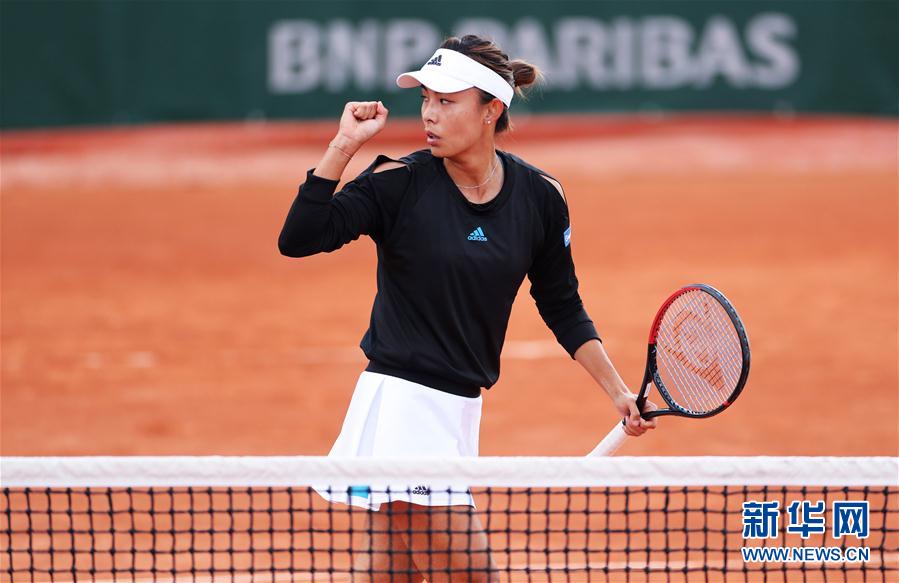 5月28日,王蔷在比赛中庆祝得分。 当日,在法国巴黎罗兰·加洛斯球场进行的2019年法国网球公开赛女单首轮比赛中,中国选手王蔷以2比0战胜队友郑赛赛,晋级下一轮。 新华社记者高静摄