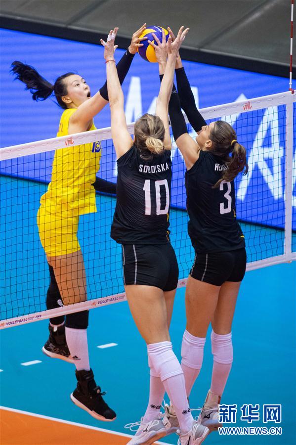5月29日,中国队球员张常宁(左一)在比赛中。 当日,在澳门综艺馆举行的2019澳门国际排联世界女子排球联赛中,中国队以3比0战胜比利时队。 新华社记者张金加摄