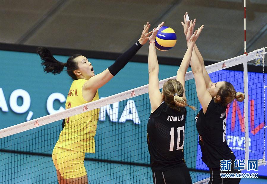 5月29日,中国队球员张常宁(左)在比赛中。 当日,在澳门综艺馆举行的2019澳门国际排联世界女子排球联赛中,中国队以3比0战胜比利时队。 新华社记者卢炳辉摄