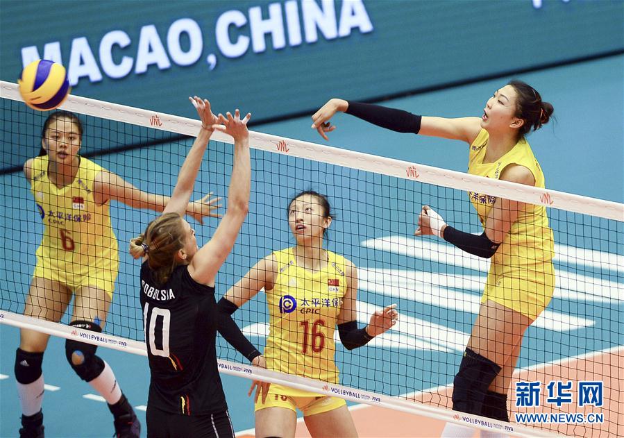 5月29日,中国队球员袁心玥(右)在比赛中扣球。 当日,在澳门综艺馆举行的2019澳门国际排联世界女子排球联赛中,中国队以3比0战胜比利时队。 新华社记者卢炳辉摄