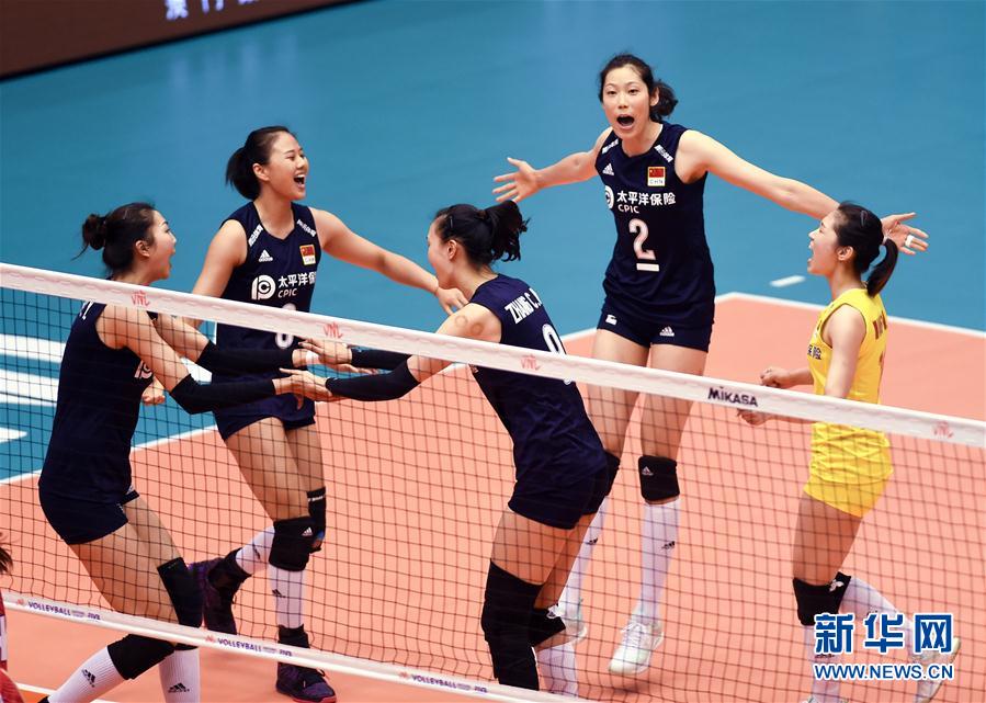 5月30日,中国队球员庆祝得分。 当日,在澳门综艺馆举行的2019澳门国际排联世界女子排球联赛中,中国队以3比0战胜韩国队。 新华社记者卢炳辉摄