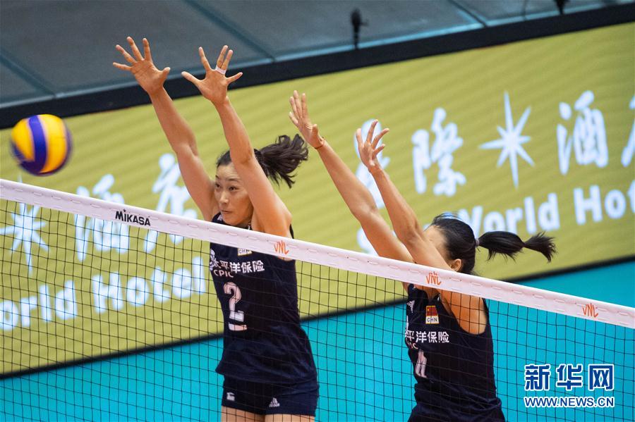 5月30日,中国队球员朱婷(左)在比赛中拦网。 当日,在澳门综艺馆举行的2019澳门国际排联世界女子排球联赛中,中国队以3比0战胜韩国队。 新华社记者张金加摄