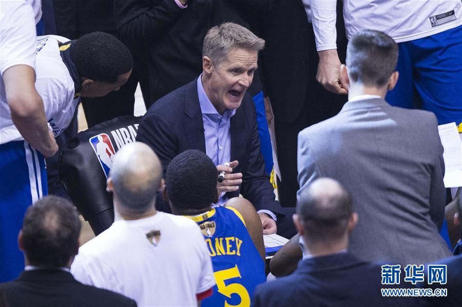 5月30日,勇士队主教练科尔(中)在比赛间隙布置战术。 当日,在2018-2019赛季NBA总决赛首场比赛中,多伦多猛龙队主场以118比109战胜金州勇士队,总比分以1比0暂时领先。 新华社发(邹峥摄)