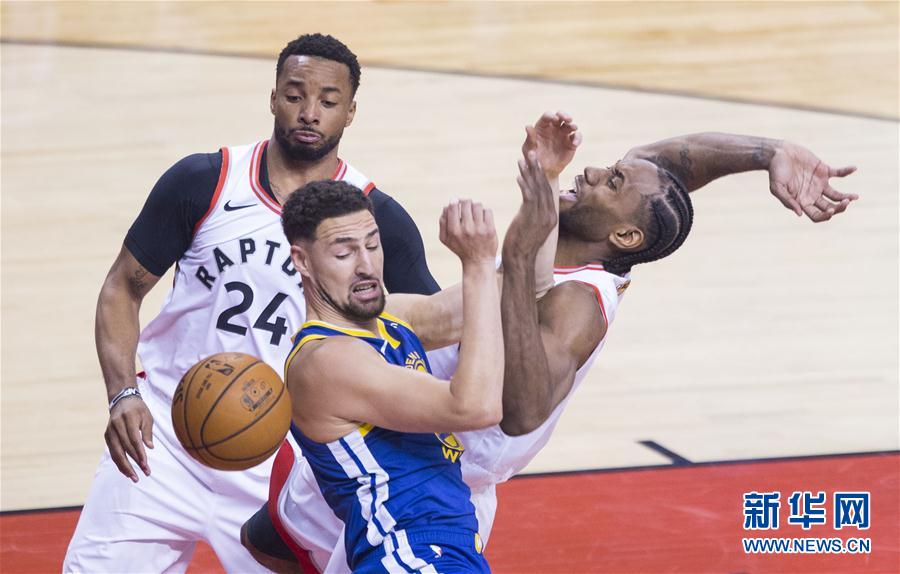 5月30日,猛龙队球员伦纳德(右)与勇士队球员克莱·汤普森(中)在比赛中拼抢。 当日,在2018-2019赛季NBA总决赛首场比赛中,多伦多猛龙队主场以118比109战胜金州勇士队,总比分以1比0暂时领先。 新华社发(邹峥摄)