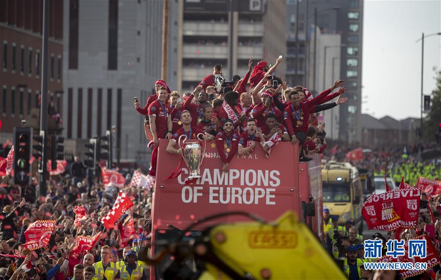 利物浦队球员与球迷在巡游活动上。 当日,英超利物浦队在利物浦举行巡游活动,与球迷共同庆祝夺得欧冠联赛冠军。6月1日,在西班牙马德里进行的2018-2019赛季欧洲足球冠军联赛决赛中,利物浦队以2比0战胜托特纳姆热刺队,夺得冠军。 新华社发