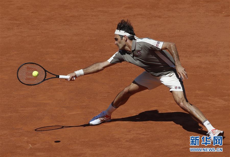 费德勒在比赛中回球。 当日,在法国巴黎罗兰·加洛斯球场进行的2019年法国网球公开赛男单第四轮比赛中,瑞士选手费德勒以3比0战胜阿根廷选手马耶尔,晋级八强。 新华社记者韩岩摄