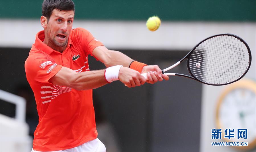 6月3日,焦科维奇在比赛中回球。 当日,在法国巴黎罗兰·加洛斯球场进行的2019年法国网球公开赛男单第四轮比赛中,塞尔维亚选手焦科维奇以3比0战胜德国选手施特鲁夫,晋级八强。 新华社记者高静摄