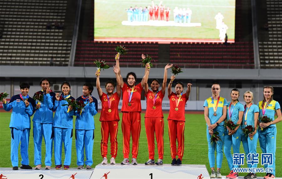 6月4日,冠军中国队(中)、亚军泰国队(左)和季军哈萨克斯坦队在颁奖仪式上。 当日,2019亚洲田径大奖赛系列赛在重庆市江津区体育场举行,在女子4x100米接力决赛中,中国队以43秒54的成绩夺得冠军。 新华社记者刘潺摄