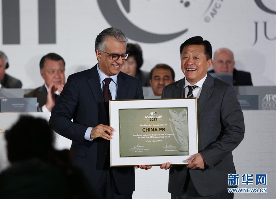 6月4日,亚足联主席萨尔曼(左)向国家体育总局副局长、中国足球协会党委书记杜兆才颁发2023亚洲杯承办权证书。 当日,亚足联在巴黎召开特别代表大会,期间确认中国获得2023年亚洲杯举办权,这是中国继2004年后再度承办该项赛事。 新华社记者高静摄