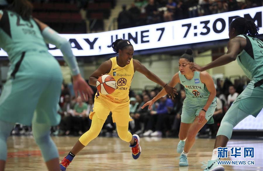 6月4日,洛杉矶火花队球员格雷(左二)在比赛中突破。 当天,在2019赛季WNBA常规赛的一场比赛中,纽约自由人队主场以73比78不敌洛杉矶火花队。 新华社记者王迎摄