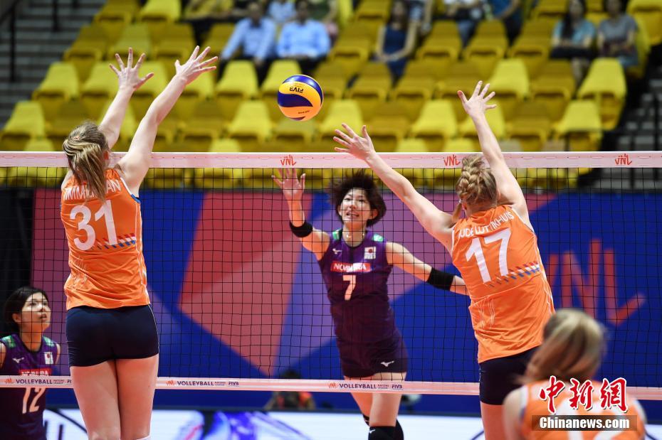6月6日,香港排球总会主办的“FIVB世界女排联赛香港2019”于香港体育馆举行最后一天的赛事。日本队以3-0轻取荷兰。3天赛事中,日本队以1胜2负的成绩完成香港站的赛事。图为日本队轻松得分。中新社记者 李志华 摄