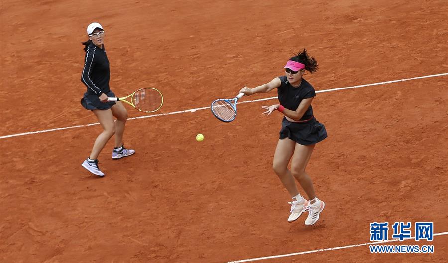 6月9日,段莹莹(右)/郑赛赛在比赛中。 当日,在法国巴黎罗兰·加洛斯球场进行的2019年法国网球公开赛女双决赛中,匈牙利选手巴博什与法国选手姆拉德诺维奇以2比0战胜中国选手段莹莹/郑赛赛,获得冠军。 新华社记者韩岩摄