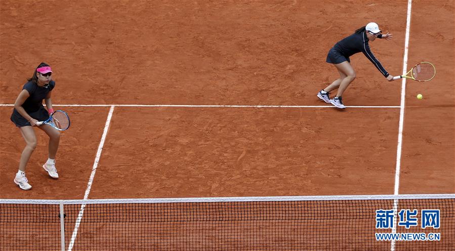 6月9日,段莹莹/郑赛赛(右)在比赛中。 当日,在法国巴黎罗兰·加洛斯球场进行的2019年法国网球公开赛女双决赛中,匈牙利选手巴博什与法国选手姆拉德诺维奇以2比0战胜中国选手段莹莹/郑赛赛,获得冠军。 新华社记者韩岩摄