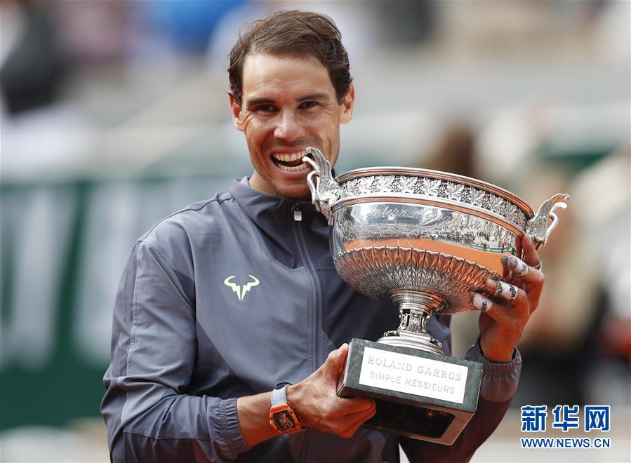 6月9日,纳达尔在颁奖仪式上捧杯。 当日,在法国巴黎罗兰·加洛斯球场进行的2019年法国网球公开赛男单决赛中,西班牙选手纳达尔以3比1战胜奥地利选手蒂姆,获得冠军。 新华社记者韩岩摄