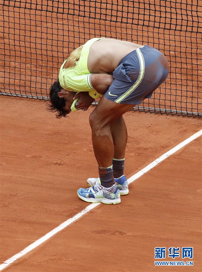 6月9日,纳达尔在获胜后庆祝。 当日,在法国巴黎罗兰·加洛斯球场进行的2019年法国网球公开赛男单决赛中,西班牙选手纳达尔以3比1战胜奥地利选手蒂姆,获得冠军。 新华社记者韩岩摄