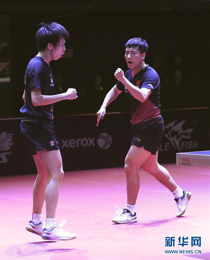 6月9日,梁靖崑(右)/林高远在比赛中。 当日,在香港伊利沙伯体育馆举行的2019年国际乒联世界巡回赛香港公开赛男双决赛中,中国选手梁靖崑/林高远以3比1战胜韩国选手张禹珍/林仲勋,获得冠军。 新华社记者卢炳辉摄