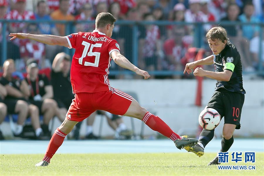 6月8日,克罗地亚队球员莫德里奇(右)与威尔士队球员劳伦斯在比赛中。 当日,在克罗地亚奥西耶克举行的2020欧洲足球锦标赛预选赛E组一场小组赛中,克罗地亚队主场以2比1战胜威尔士队。 新华社发(戈兰·施坦茨尔摄)