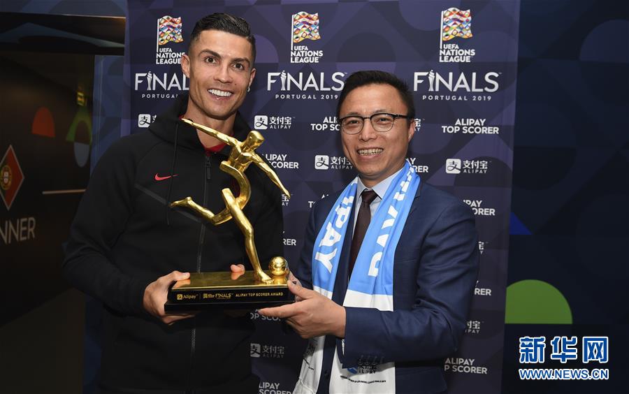 6月9日,蚂蚁金服集团董事长井贤栋(右)为克里斯蒂亚诺·罗纳尔多颁发奖杯。 当日,在葡萄牙波尔图举行的首届欧洲国家足球联赛决赛中,葡萄牙队以1比0击败荷兰队夺得冠军。克里斯蒂亚诺·罗纳尔多凭借决赛阶段的三个进球成为最佳射手。 新华社发