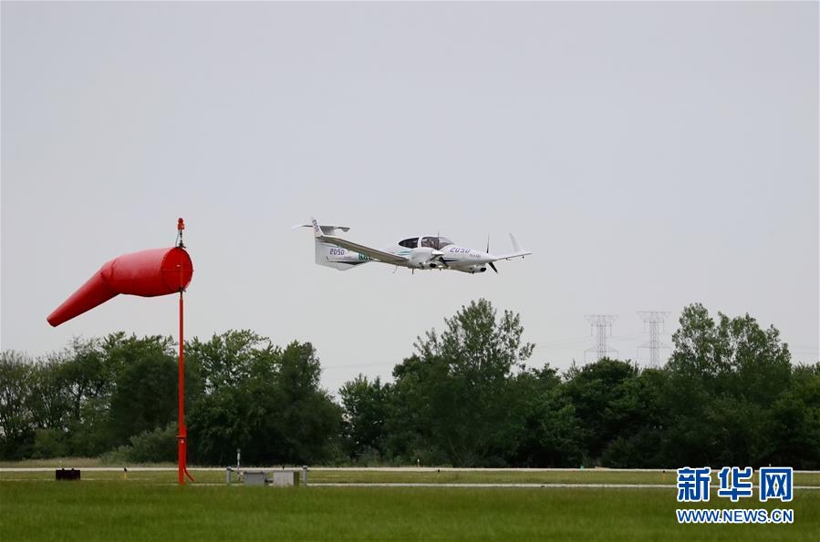 57岁的张博在历经68天的飞行、经停50次、越过三大洲和三大洋后,9日降落在美国芝加哥西南郊一小型机场,完成了自己人生的第二次环球飞行。 图为张博驾驶的DA42飞机正在降落(6月9日摄)。 新华社记者汪平摄