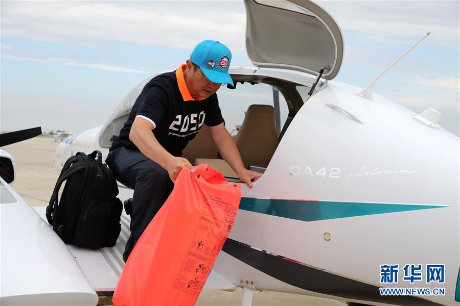 57岁的张博在历经68天的飞行、经停50次、越过三大洲和三大洋后,9日降落在美国芝加哥西南郊一小型机场,完成了自己人生的第二次环球飞行。 图为张博在降落后从飞机上卸下防护服等行李(6月9日摄)。 新华社记者汪平摄