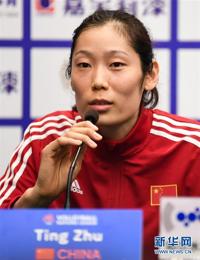 6月10日,中国女排球员朱婷在发布会上回答记者提问。 当日,2019年世界女排联赛江门站举行赛前新闻发布会。比赛将于6月11日至13日在江门体育中心举行。中国、土耳其、波兰和美国四支队伍参加本站赛事的比拼。 新华社记者邓华摄