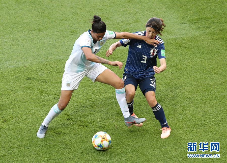 6月10日,阿根廷队球员海梅斯(左)与日本队球员鲛岛彩在比赛中拼抢。 当日,在法国巴黎举行的2019年国际足联女足世界杯D组小组赛中,阿根廷队与日本队以0比0战平。 新华社记者徐子鉴摄