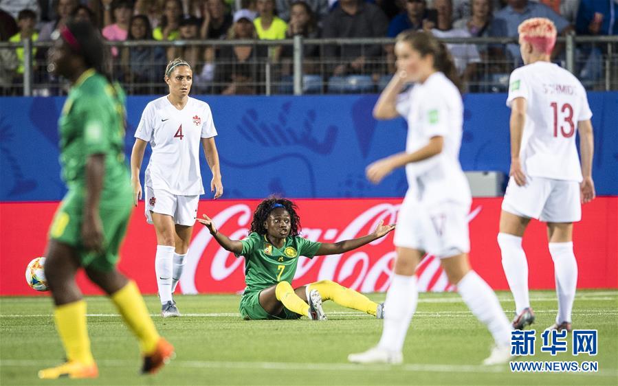6月10日,喀麦隆队球员翁圭内(中)在比赛中向裁判示意。 当日,在法国蒙彼利埃举行的2019年国际足联女足世界杯E组小组赛中,加拿大队以1比0战胜喀麦隆队。 新华社记者肖艺九摄