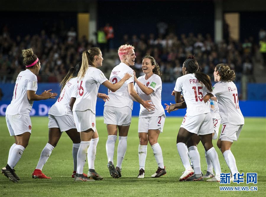 6月10日,加拿大队球员在比赛中庆祝进球。 当日,在法国蒙彼利埃举行的2019年国际足联女足世界杯E组小组赛中,加拿大队以1比0战胜喀麦隆队。 新华社记者肖艺九摄