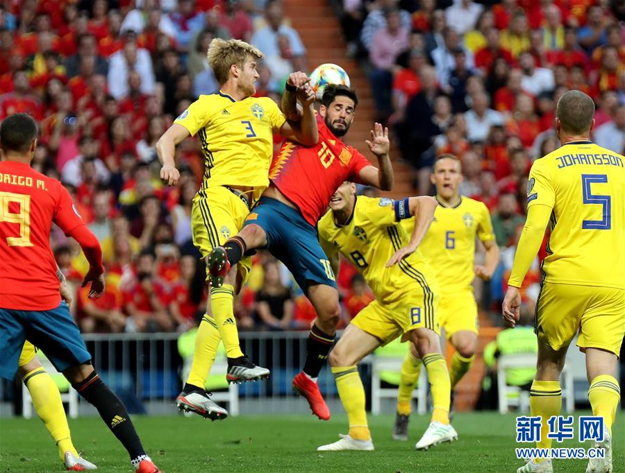 6月10日,西班牙队球员伊斯科(上右)和瑞典队球员赫兰德(上左)在比赛中争顶。 当日,在2020年欧洲足球锦标赛预选赛F组比赛中,西班牙队主场3比0战胜瑞典队。 新华社发(爱德华·皮特斯摄)