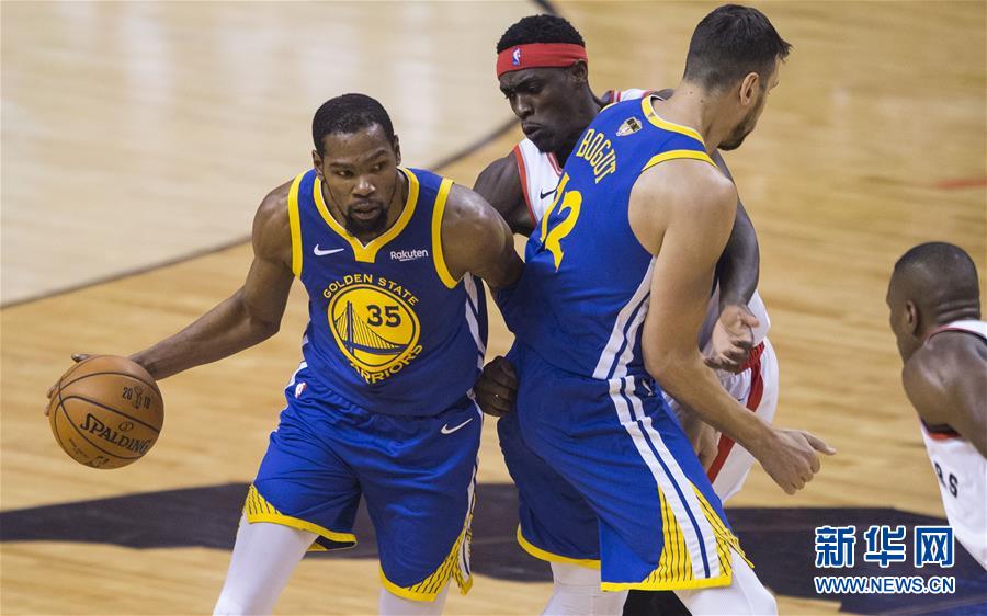 6月10日,勇士队球员杜兰特(左)在比赛中进攻。当日,在2018-2019赛季NBA总决赛第五场比赛中,多伦多猛龙队主场以105比106不敌金州勇士队,但仍以3比2的总比分暂时领先。 新华社发(邹峥摄)