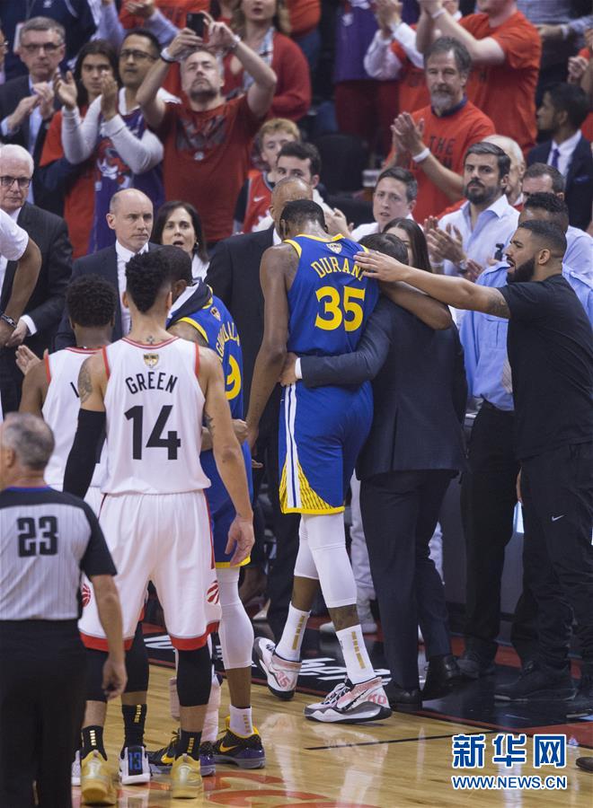 6月10日,勇士队球员杜兰特(中)在比赛中受伤离场。 当日,在2018-2019赛季NBA总决赛第五场比赛中,多伦多猛龙队主场以105比106不敌金州勇士队,但仍以3比2的总比分暂时领先。 新华社发(邹峥摄)