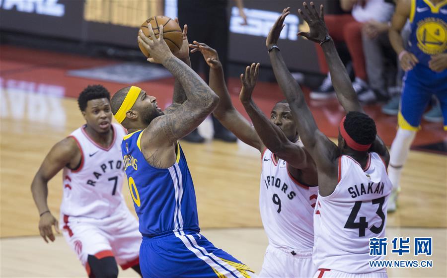 6月10日,勇士队球员考辛斯(左二)在比赛中投篮。 当日,在2018-2019赛季NBA总决赛第五场比赛中,多伦多猛龙队主场以105比106不敌金州勇士队,但仍以3比2的总比分暂时领先。 新华社发(邹峥摄)
