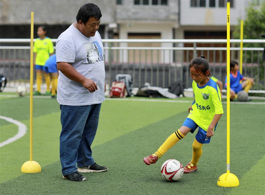 图为徐召伟(左)在指导元宝小学足球队队员练习(2019年5月29日摄)。 新华社记者欧东衢摄