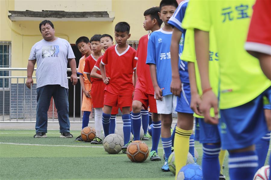 图为徐召伟(左)指导元宝小学足球队队员练习(2019年5月29日摄)。 新华社记者欧东衢摄