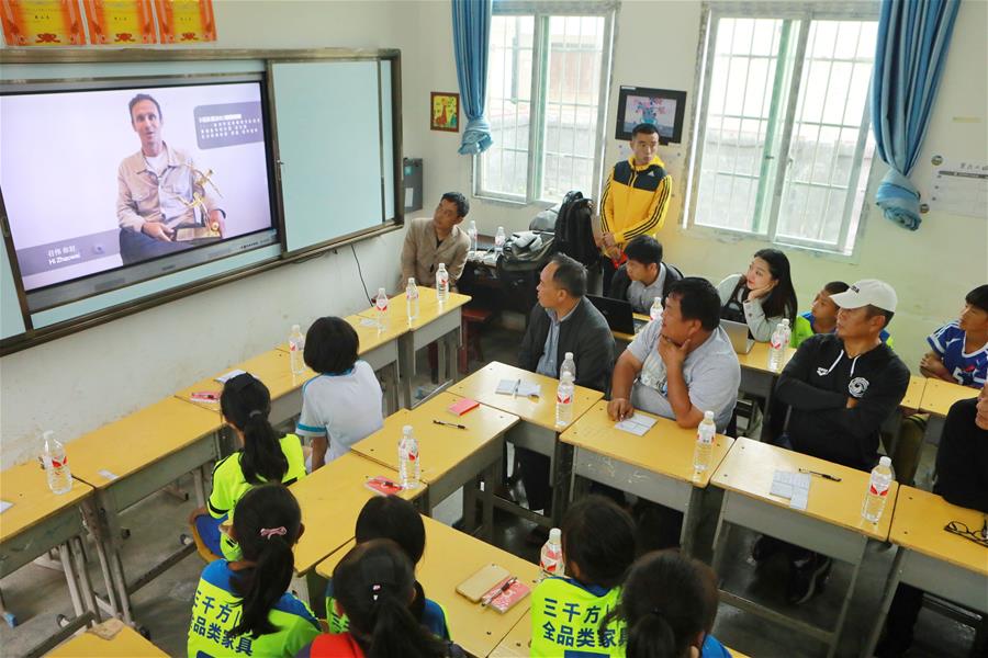 图为元宝小学师生在一起观看葡萄牙球星卡瓦略的视频,视频中卡瓦略邀请徐召伟老师前往葡萄牙观看2019欧洲国家足球联赛(2019年5月29日摄)。 新华社记者欧东衢摄