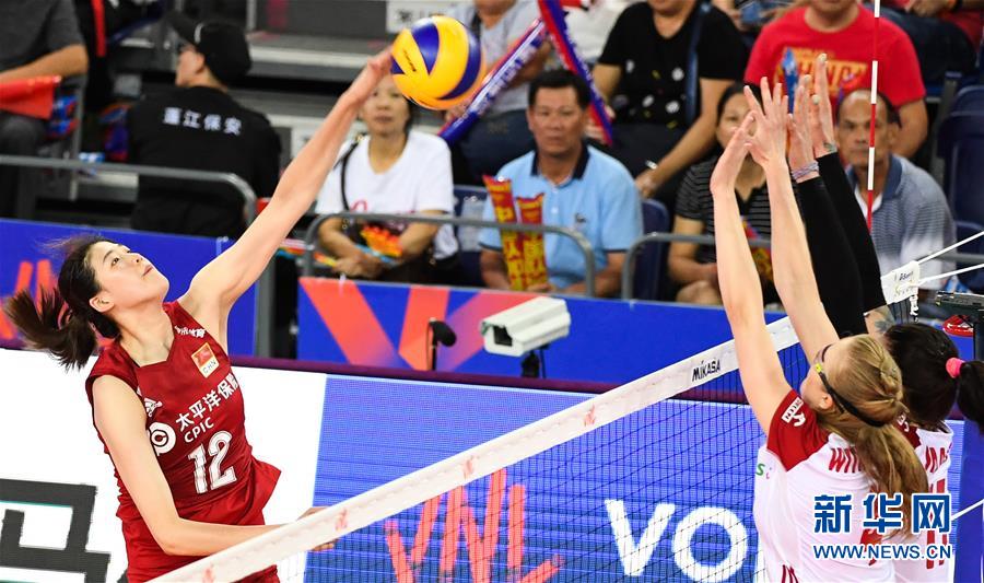 6月11日,中国队球员李盈莹(左)在比赛中扣球。 当日,在2019年世界女排联赛江门站比赛中,中国队以3比0战胜波兰队。 新华社记者邓华摄