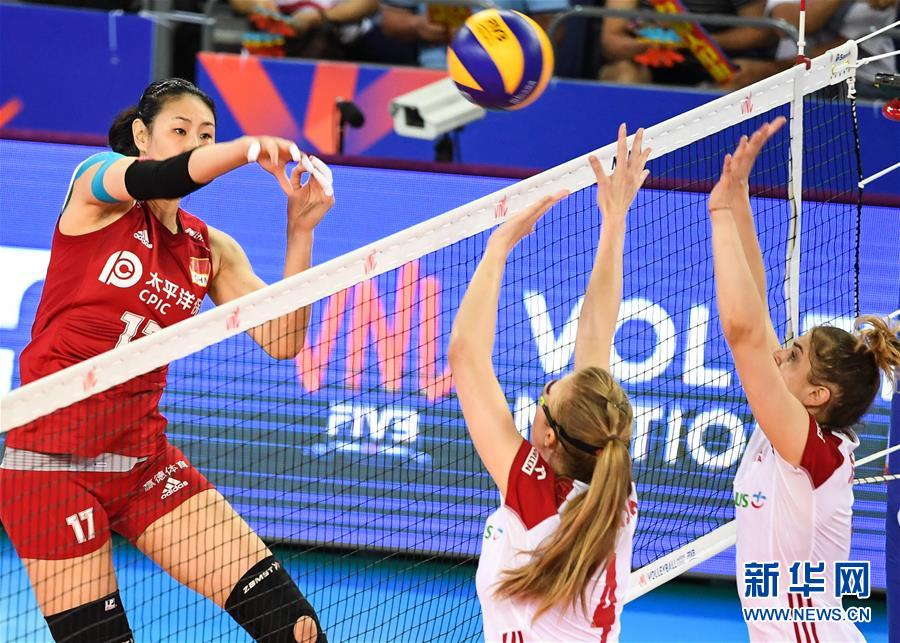 6月11日,中国队球员颜妮(左)在比赛中扣球。 当日,在2019年世界女排联赛江门站比赛中,中国队以3比0战胜波兰队。 新华社记者邓华摄