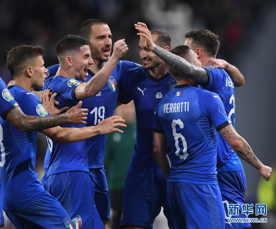 6月11日,意大利队球员在比赛中庆祝进球。 当日,在2020年欧洲足球锦标赛预选赛J组比赛中,意大利队主场以2比1战胜波黑队。 新华社发(阿尔贝托·林格里亚摄)