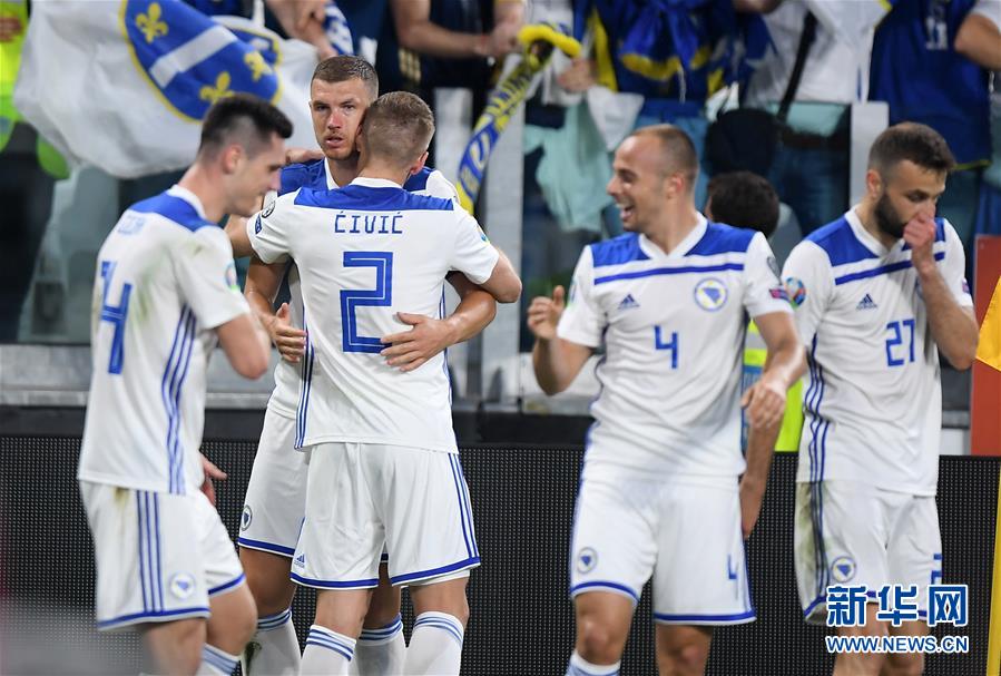 6月11日,波黑队球员哲科(左二)在进球后和队友庆祝。 当日,在2020年欧洲足球锦标赛预选赛J组比赛中,意大利队主场以2比1战胜波黑队。 新华社发(阿尔贝托·林格里亚摄)