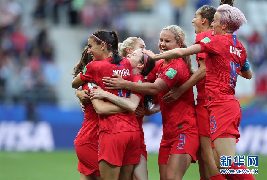 6月11日,美国队球员庆祝进球。 当日,在法国兰斯举行的2019年国际足联女足世界杯F组小组赛中,美国队以13比0战胜泰国队。 新华社记者程婷婷摄