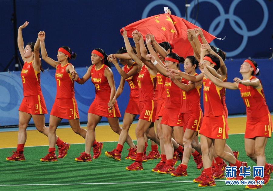 2008年8月22日,在北京奥运会曲棍球女子决赛中,中国队以0比2负于荷兰队获得亚军,取得历史性的突破。图为中国队球员在比赛结束后挥舞国旗,向观众致意。 新华社记者杨磊摄