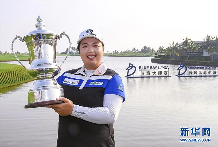 2017年11月11日,在海南陵水举行的女子职业高尔夫球协会(LPGA)蓝湾大师赛中,中国选手冯珊珊以279杆,低于标准杆9杆的成绩夺得冠军。图为冯珊珊手捧冠军奖杯留影。 新华社发