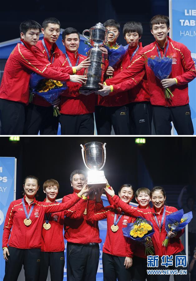 拼版照片上图:2018年5月6日,在瑞典哈尔姆斯塔德举行的2018年乒乓球世界团体锦标赛男团决赛3比0战胜德国队后,中国队队员和教练刘国正(左三)捧起斯韦思林杯。新华社记者叶平凡摄 下图:2018年5月5日,在瑞典哈尔姆斯塔德举行的2018年乒乓球世界团体锦标赛女团决赛3比1战胜日本队后,中国队队员和教练李隼(左三)在颁奖仪式上捧起考比伦杯。新华社记者叶平凡摄