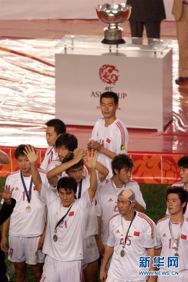 2004年8月7日,在北京举行的2004年亚洲杯冠亚军争夺战中,中国队以1比3不敌日本队,获得亚军。图为获得亚军的中国队球员在领奖台上向观众致意。 新华社记者李俊东摄