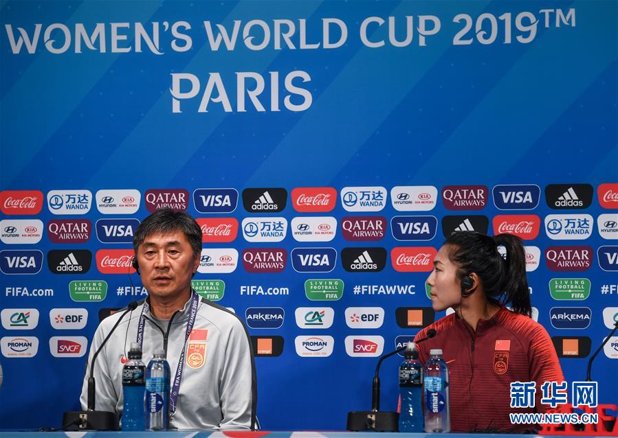 6月12日,中国队主教练贾秀全(左)、球员古雅沙在发布会上。 当日,中国队在法国巴黎举行女足世界杯B组小组赛第二场比赛的赛前新闻发布会。中国队将于北京时间14日凌晨迎战南非队。 新华社记者毛思倩摄