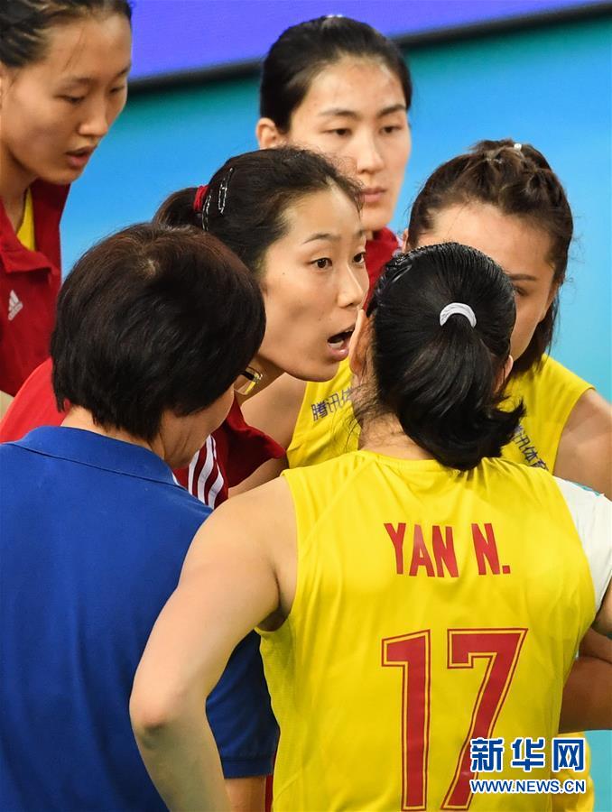 6月12日,中国女排队员朱婷(中)在比赛间隙与队友交流。 当日,在2019年世界女排联赛江门站比赛中,中国队以3比0战胜土耳其队。 新华社记者邓华摄