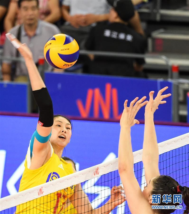 6月12日,中国女排队员颜妮(左)在比赛中扣球。 当日,在2019年世界女排联赛江门站比赛中,中国队以3比0战胜土耳其队。 新华社记者邓华摄
