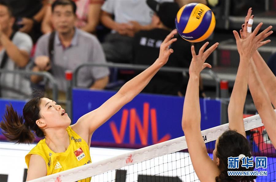 6月12日,中国女排队员李盈莹(左)在比赛中进攻。 当日,在2019年世界女排联赛江门站比赛中,中国队以3比0战胜土耳其队。 新华社记者邓华摄