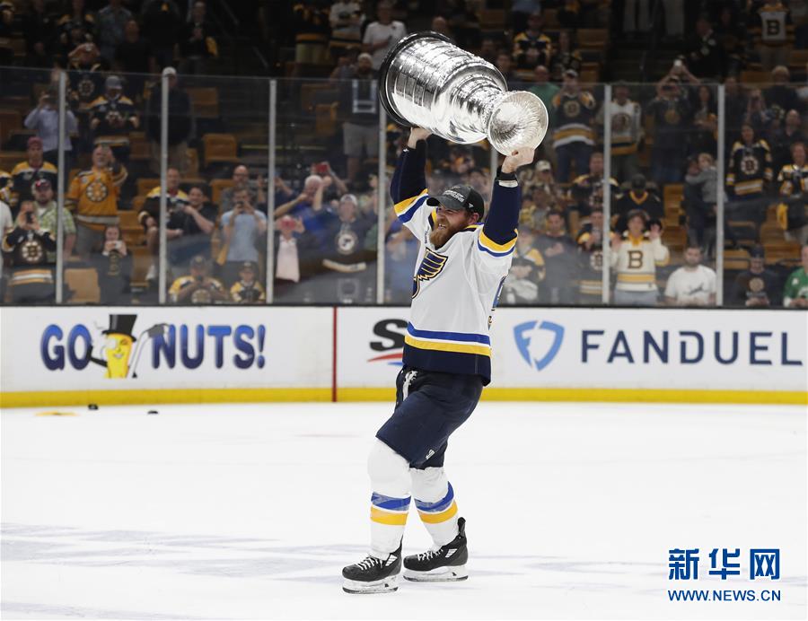 6月12日,蓝调队球员奥赖利高举斯坦利杯庆祝夺冠。 当日,在2018-2019赛季NHL总决赛第七场比赛中,圣路易斯蓝调队客场以4比1战胜波士顿棕熊队,从而以4比3的总比分夺冠,捧得斯坦利杯。 新华社/路透